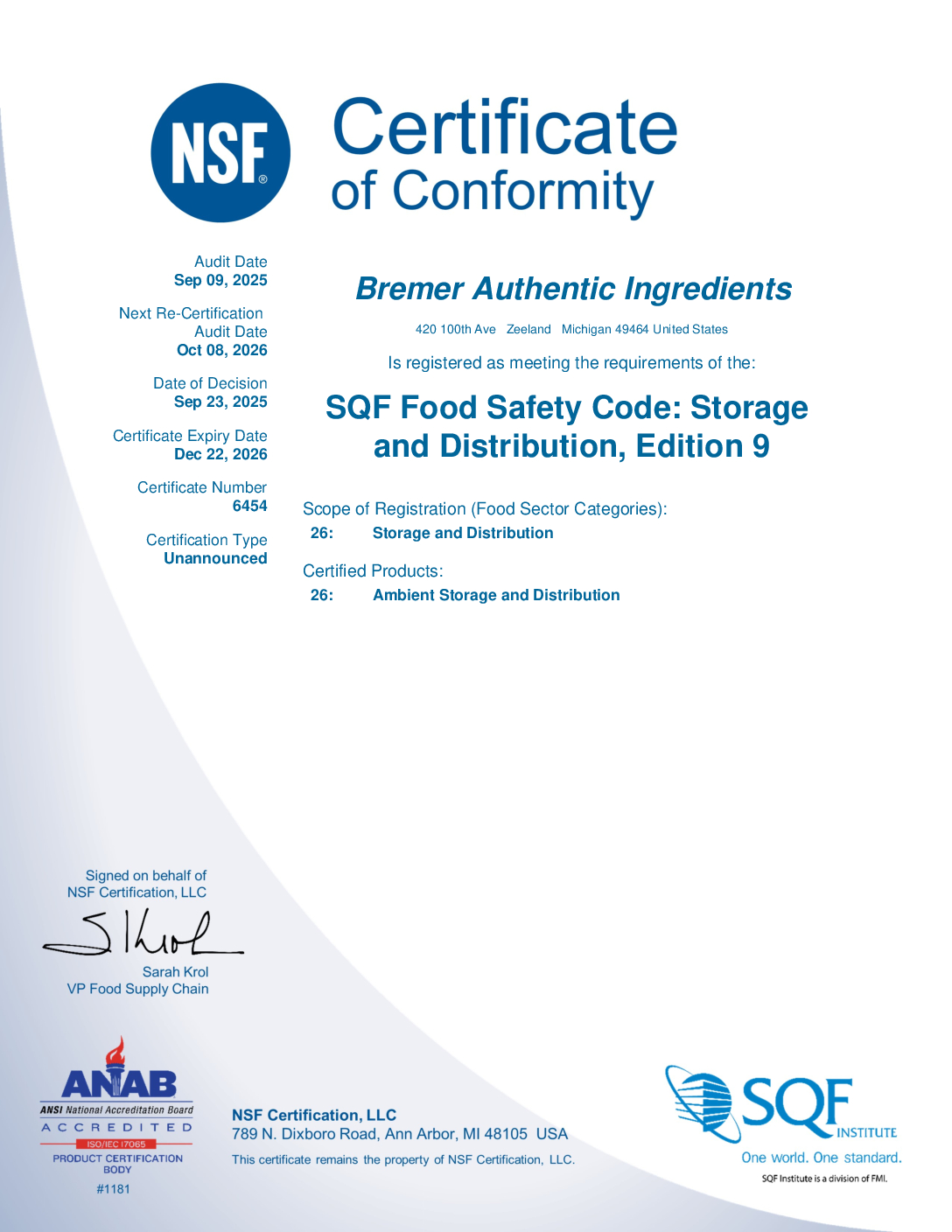 SQF Food Safety Code for Storage and Distribution, Certified by NSF International